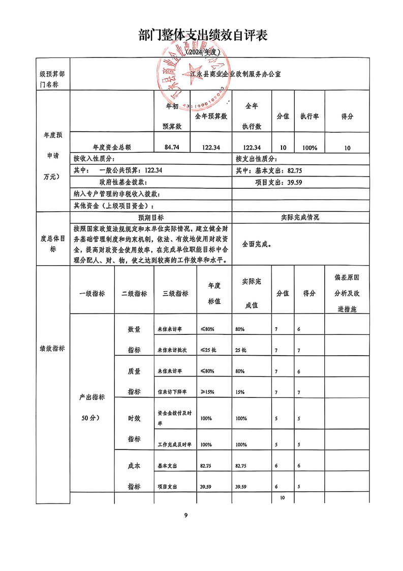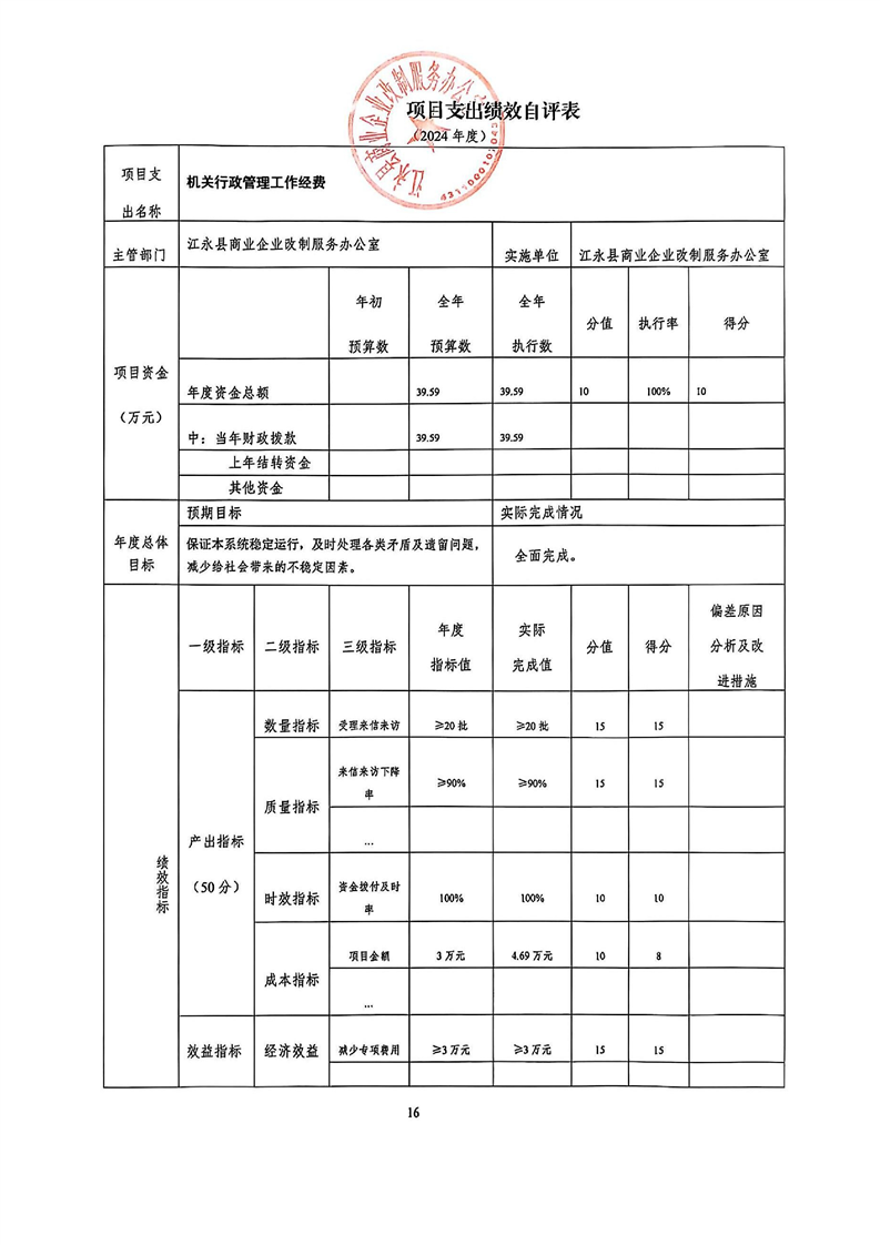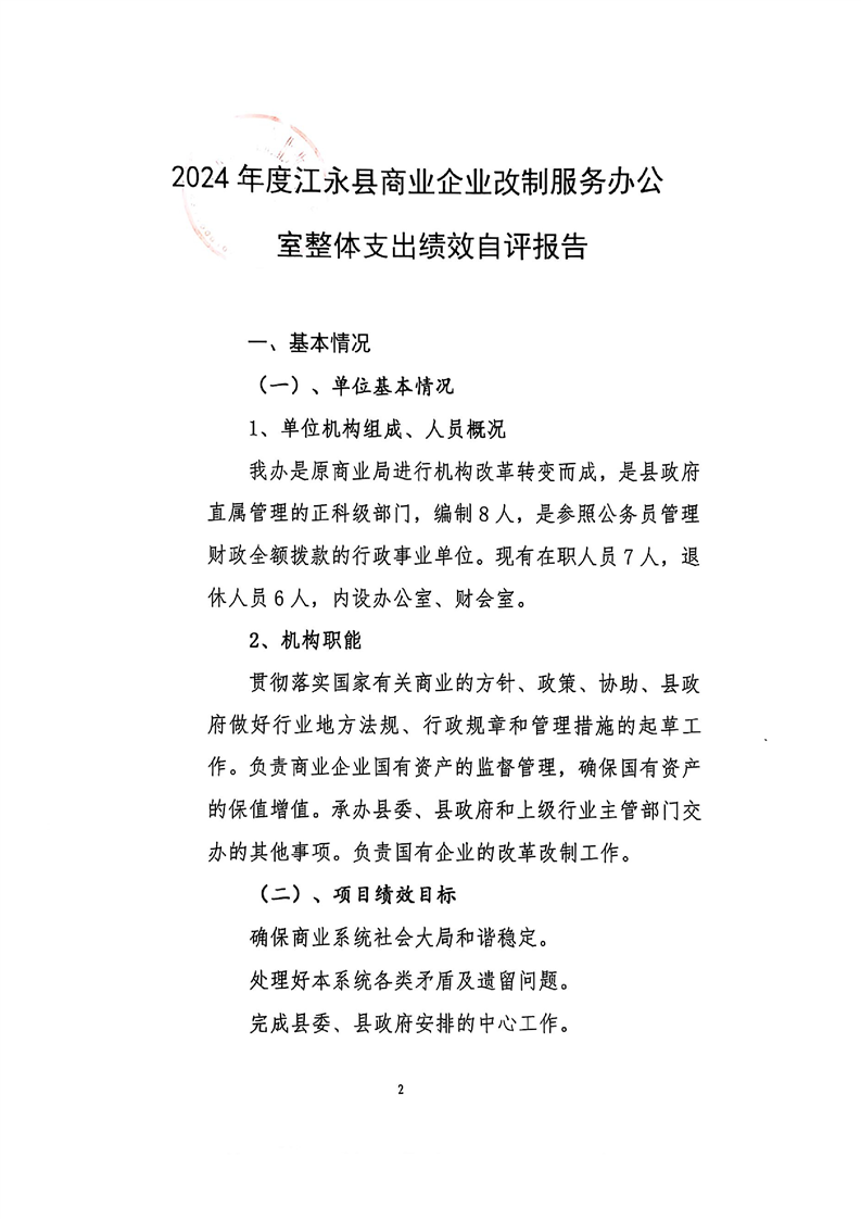 2024年度江永县商业企业改制服务办公室整体支出绩效自评报告