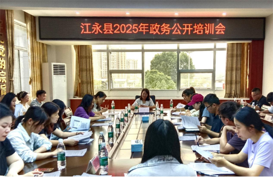 近日,江永县数据局组织召开2025年政务公开工作培训会,局党组成员、副局长欧阳珍主持会议。县直有关部门、乡镇共34个单位负责政务公开工作人员参加培训。