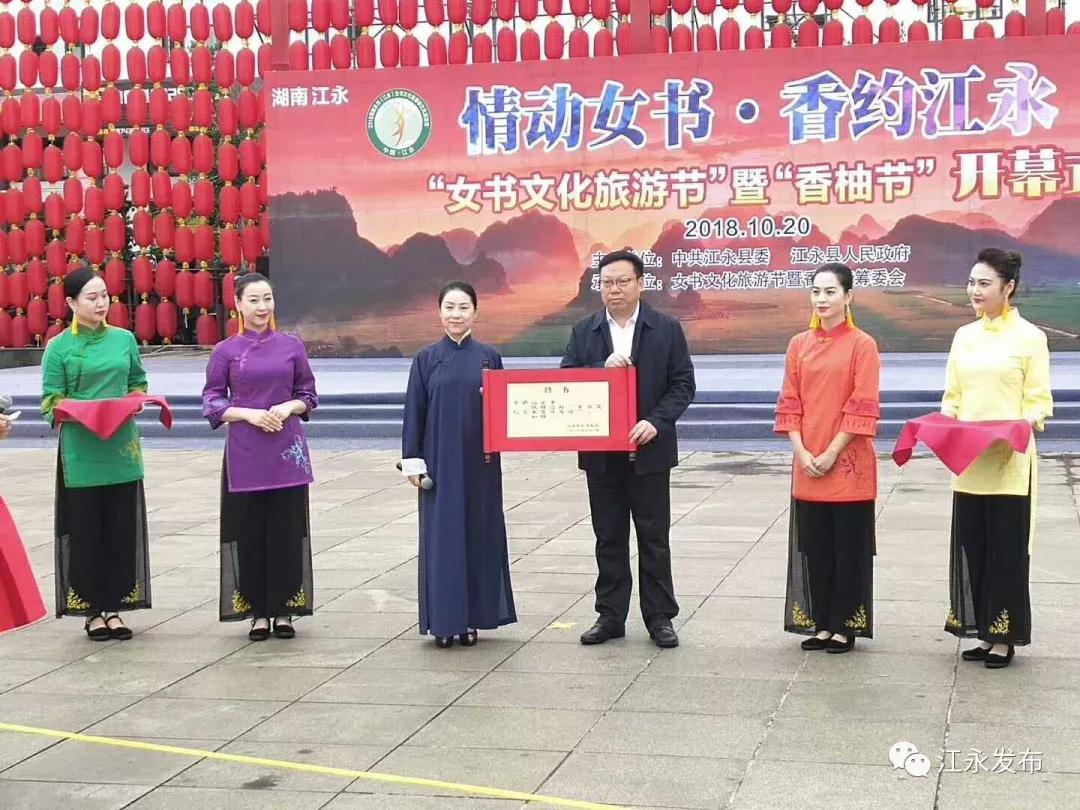 开幕式上,周立夫授予《女书组歌》演唱者李雨儿女士“女书文化艺术宣传大使”。女书书画大赛组织单位负责人作发表感言,21个女书旗袍队分别作了设计理念介绍,展示了在旗袍上融入女书独有的八角花等女书文化元素,设计更具特色,旗袍更典雅,更有女性神韵。现场还为前期举办的大学生女书文创大赛获奖者和“十佳柚园”获得者进行了颁奖,并举行了江永县与旅行社的合作签约。