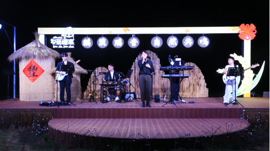 非遗表演余韵未消,花海稻田中的音乐节舞台便已亮起灯光。瑶族长歌与现代旋律碰撞融合,歌声伴随着晚风穿过金黄稻浪,形成独特的自然共鸣。台下观众或坐或立,在稻香中跟着节奏轻唱,不少游客举起手机记录这一美好瞬间,欢声笑语久久回荡。