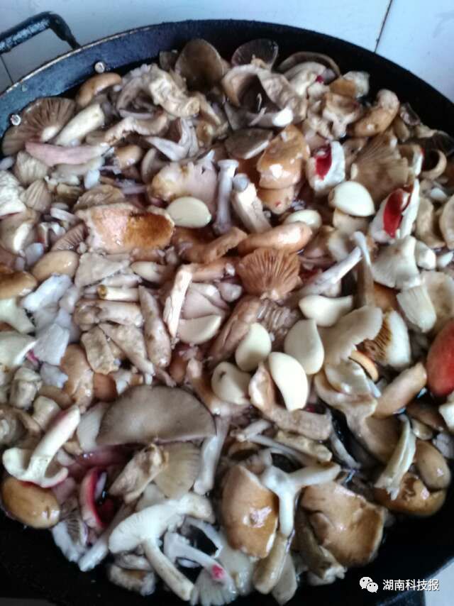 ▲上图为患者加工野生蘑菇时所拍。患者在加工野生蘑菇时放了大量大蒜,由于大蒜未变黑,患者认为可食,结果致一家6人全部中毒,其中2人死亡。