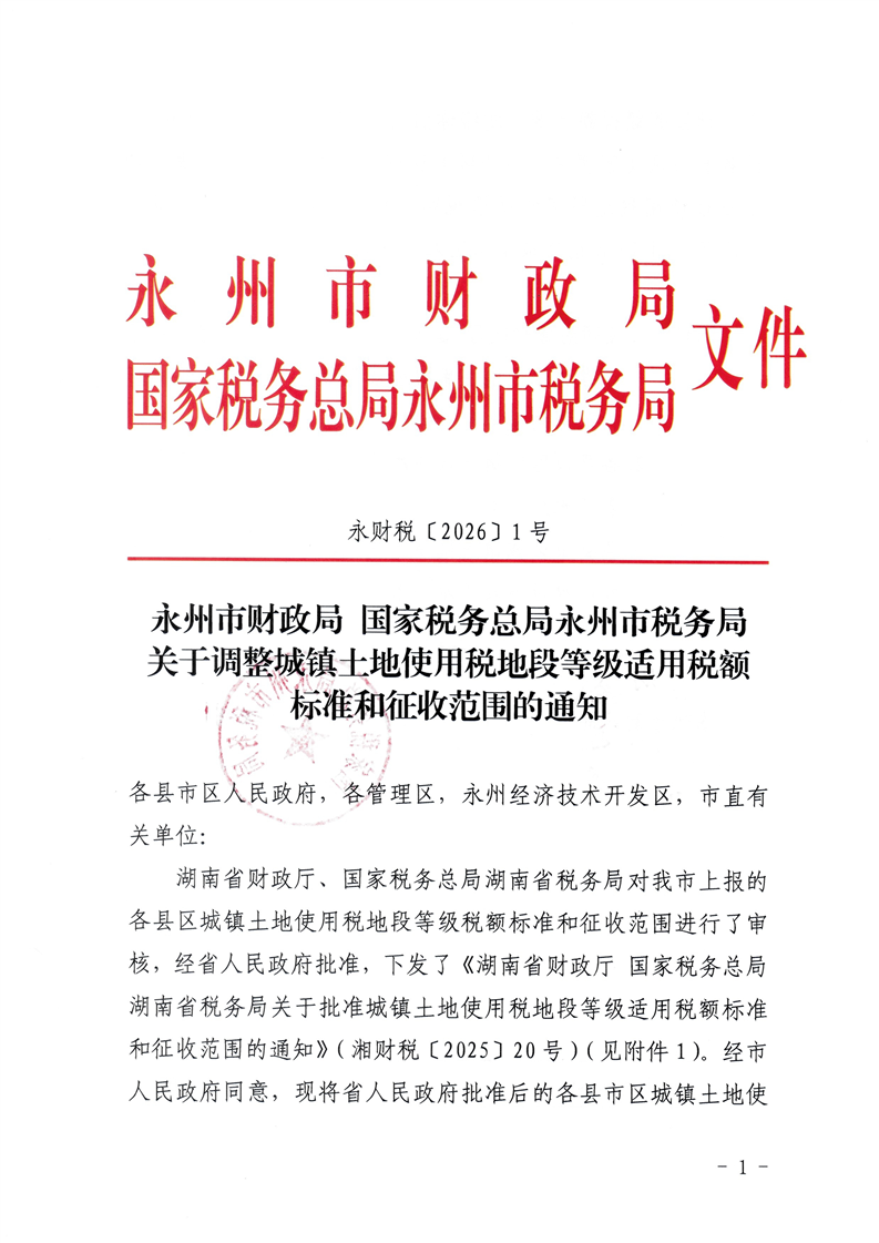 关于转发《永州市财政局 国家税务总局永州市税务局 关于调整城镇土地使用税地段等级适用税额标准和征收范围的通知》的通知