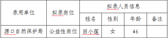 根据公益性岗位开发管理有关工作相关规定,经公开报名、招录单位资格审查与面试等环节和程序,拟录用田小莲同志为公益性岗位人员,聘用期为2026年5月1日至2026年12月31日,现予以公示,公示期为7天(2026年4月20日至4月26日)。公示期间,如对拟录用人员有异议,请向县人社局反映(联系电话:0746-5752352)