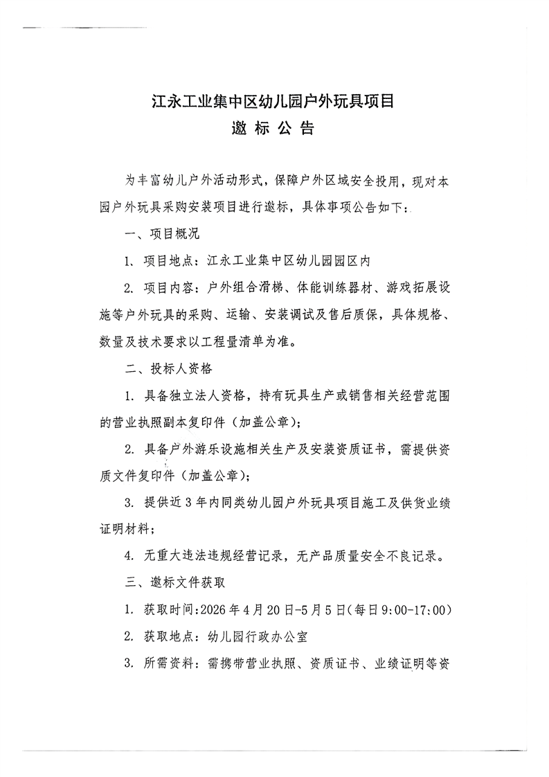 江永工业集中区幼儿园户外玩具项目邀标公告