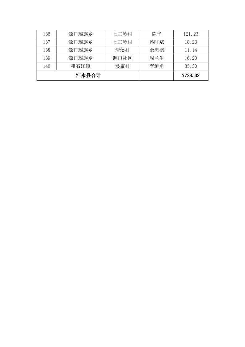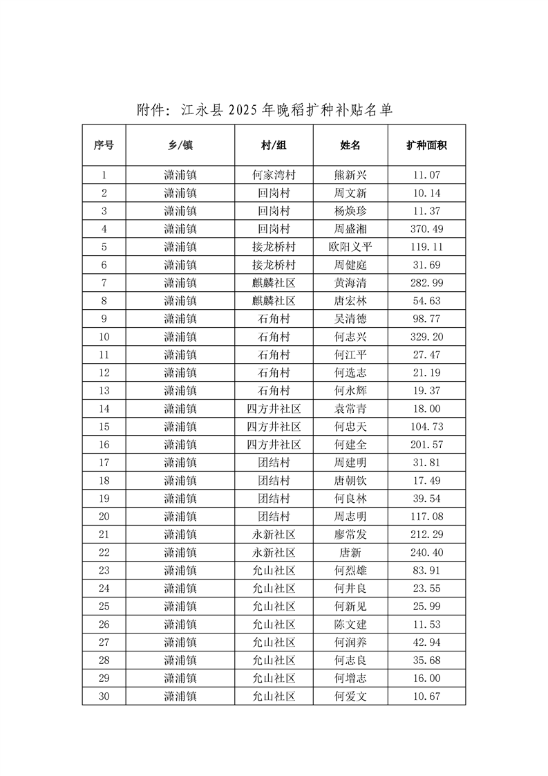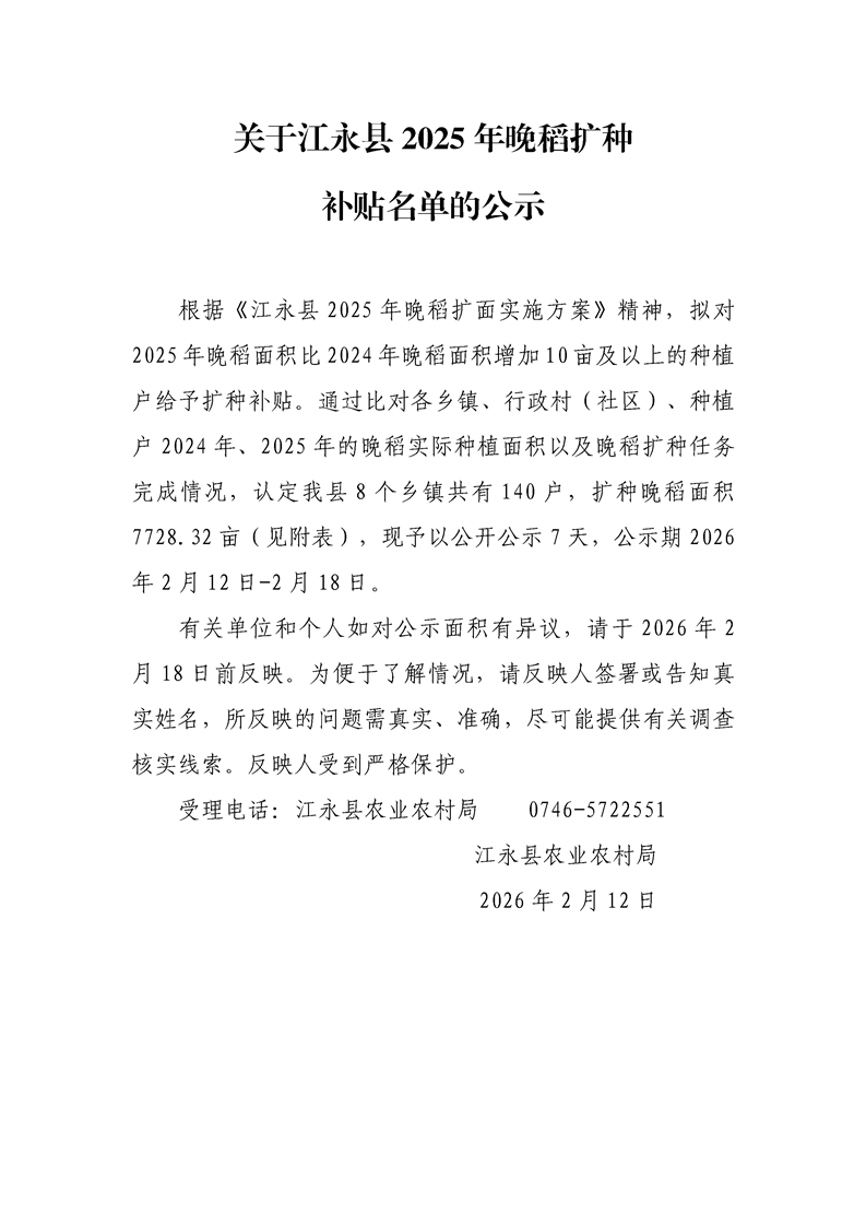 关于江永县2025年晚稻扩种补贴名单的公示